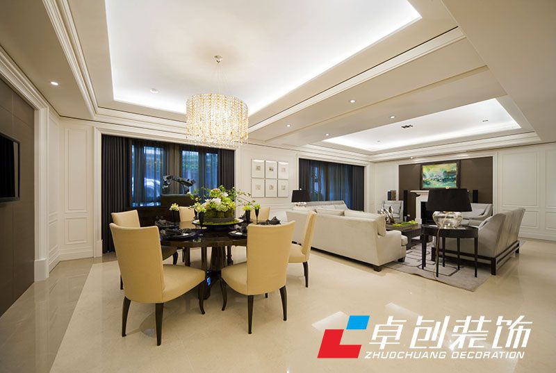 餐厅效果图:客餐厅一体的设计让整个空间的整体延展性得到了很好的体现,同时吊顶的设计又让两个功能区有了相对的分隔。华丽的吊灯给餐厅增加了一丝氛围感。